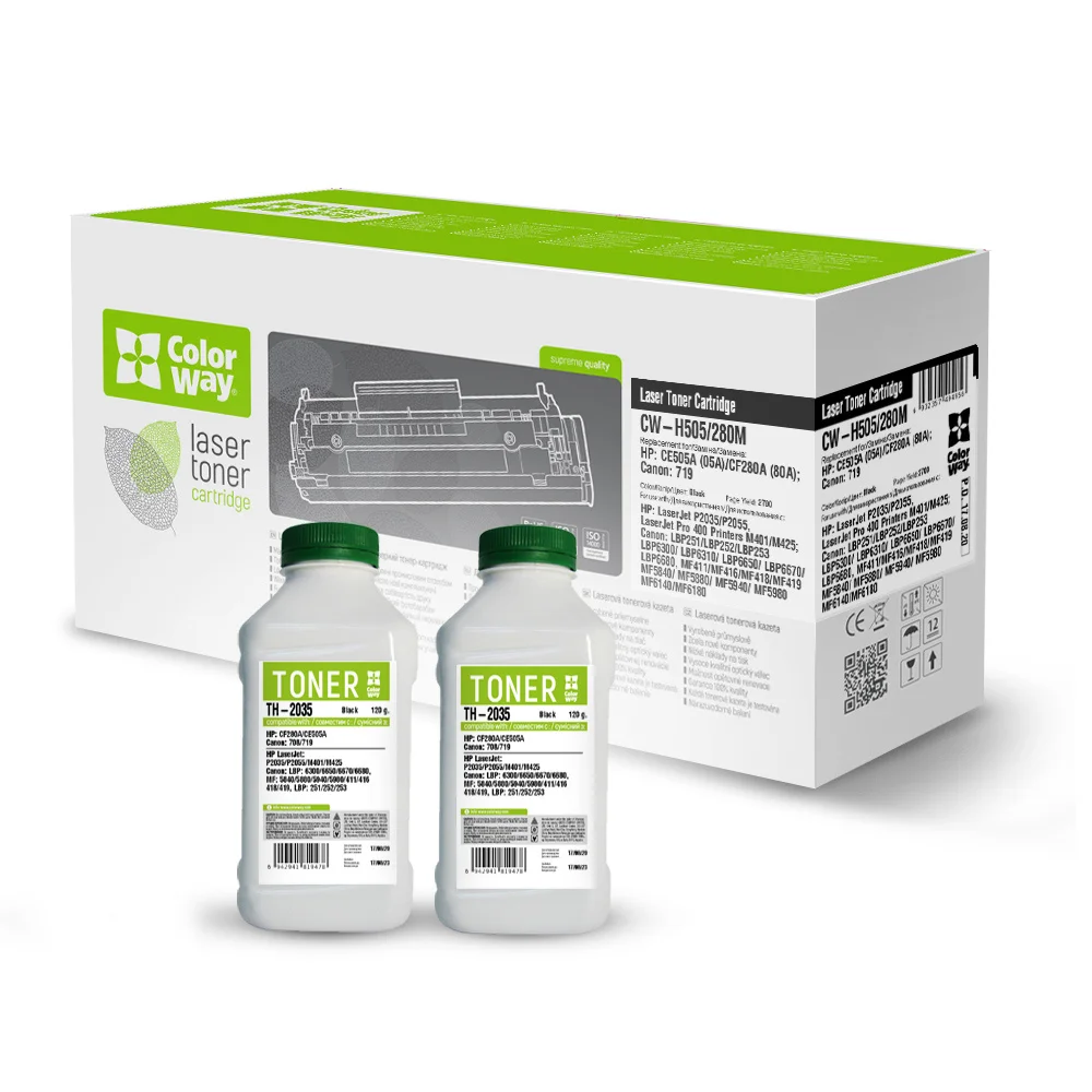 Забезпечте високу якість друку завдяки тонер-картриджу COLORWAY для HP CE505A/CF280A Black + тонер TH-2035. Цей сумісний картридж створений для надійної та професійної роботи, завжди гарантуючи чіткі друковані матеріали. Завдяки великому обсягу друку, який становить 2700 сторінок при 5%-ному покритті, ви зможете друкувати більше без втрати якості. Тонер-картридж сумісний з різними принтерами HP та Canon, зокрема з LaserJet P2035, LaserJet Pro 400 M401 та Canon LBP 6300.