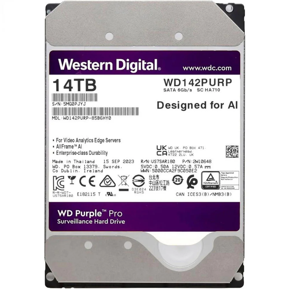 WD Purple Pro WD142PURP - це 3.5-дюймовий внутрішній жорсткий диск ємністю 14 ТБ, розроблений спеціально для систем відеоспостереження, які потребують високої ємності та надійного відеозапису. Він працює зі швидкістю обертання шпинделя 7200 об/хв і має кеш-пам'ять 512 МБ, а інтерфейс SATA 6.0 Гбіт/с забезпечує ефективну швидкість передачі даних.