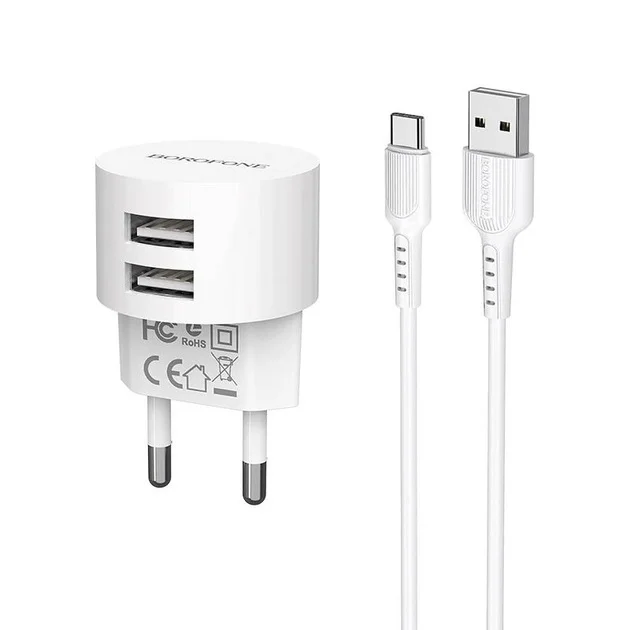 Мережевий зарядний пристрій Borofone BA23A Brilliant (2USB, 2.4А) White (BA23ACW) + кабель Type-C