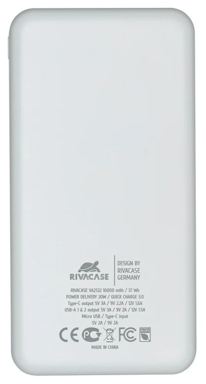 RIVACASE Rivapower VA2532 QC/PD 20W 10000mAh White - идеальное сочетание высокой производительности и стильного дизайна. Этот повербанк, оснащенный передовыми технологиями зарядки, обеспечивает быструю и надежную зарядку ваших устройств.