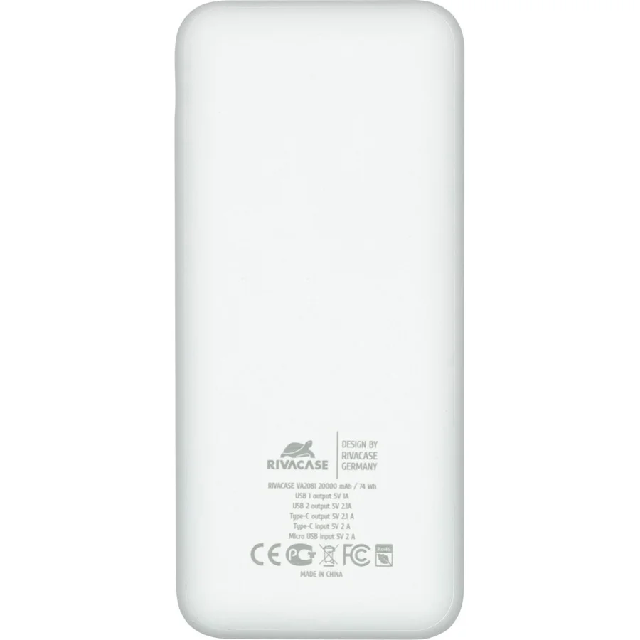 Элегантный белый корпус повербанка RIVACASE Rivapower VA2081 обеспечивает ему стильный вид, а компактные размеры и легкий вес делают его удобным для ежедневного ношения.