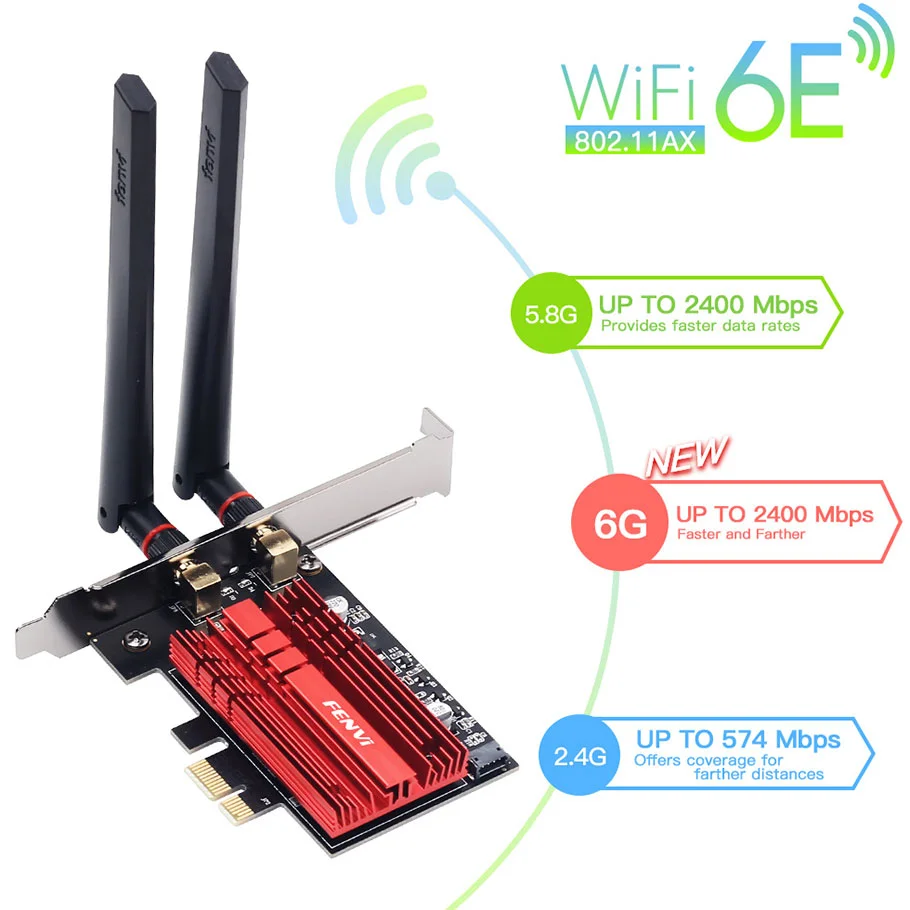 Fenvi FV-AXE3000 (Intel AX210) - это высокопроизводительный PCIe Wi-Fi адаптер на базе новейшего чипсета Intel AX210, использующий технологию Wi-Fi 6E для обеспечения расширенных возможностей беспроводной связи для настольных компьютеров.